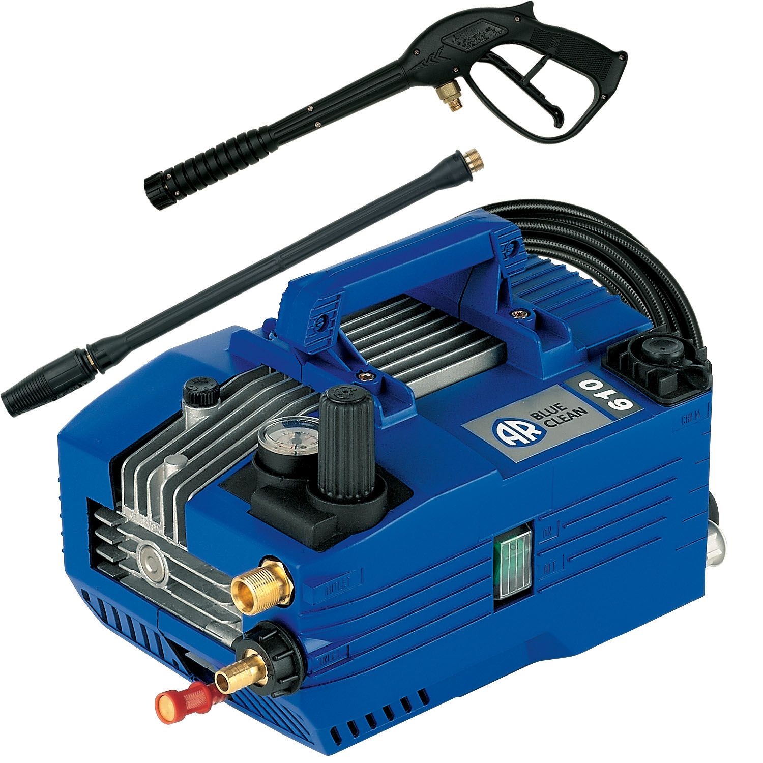 AR Blue Clean AR610 Industrial electric pressure washer. This cold water pressure cleaner is fitted with AR renowned Triplex Pump with ceramic plungers and double packing industrial seals. Powerful induction motor, gun-wand assembly, thermal protector, pressure adjustment, pressure gauge and built in detergent suction. Feature forged aluminum pump head. A product of Annovi Reverberi S.p.A, Italy, the largest privately owned company of Triplex Plunger Pumps in the world Product Features: Split lance for fast sudsing and power cleaning, pressure adjustment, built in detergent suction, pressure gauge are all features Automatic safety valve with low pressure by-pass Detergent injector kit with low pressure soap Thermal switch shuts off when temperature rises too high It is designed to be compact and very portable Detergent tank and handle allow for easy movement between jobsA safety lock prevents the trigger from accidentally engaging when not in use It is equipped with GFCI to shut down power supply in the event of electrical ground failure. Most Vacuums & Pressure Washers products are available for in-store pickup from Advance Auto Parts.